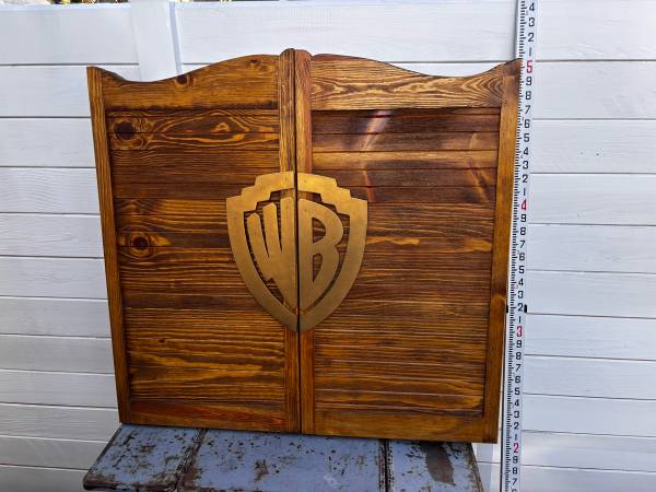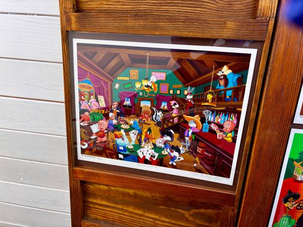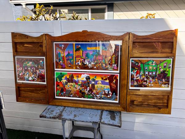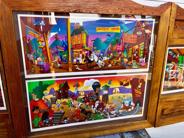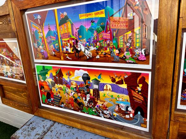 Looney Tunes Western Suite of 4 named: Courtune, Tune Saloon, Tune Town, Tunestone Territory. Ready to wall hang. 36" tall x 37.5" wide with saloon doors closed 75.5" wide with doors open to view art. Dated 1995.