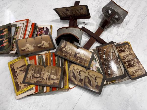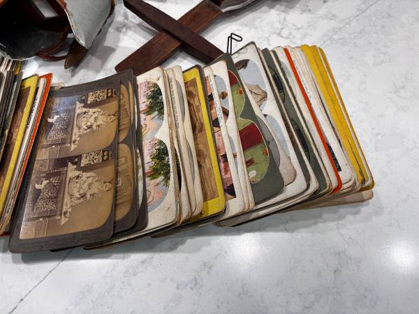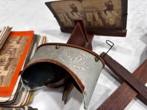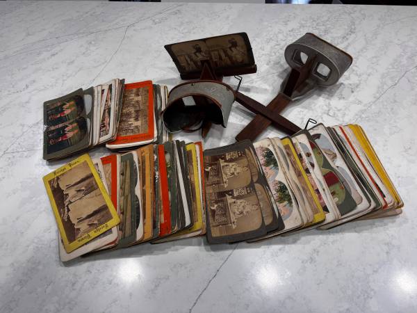 stereoviewer stereoscope with 150 slides cards complete collection for one price. Underwood & Underwood patent date 1901 viewers. Antique collectable toy picture photography photo toys.