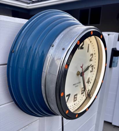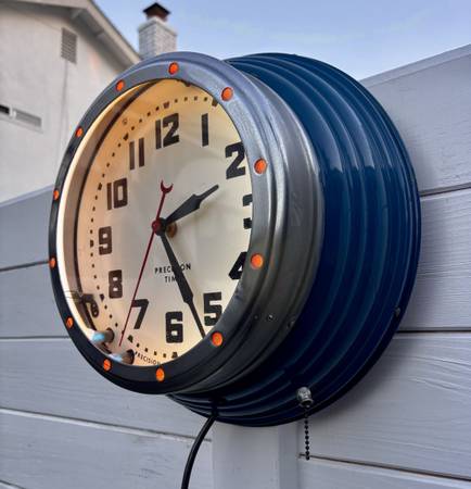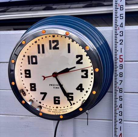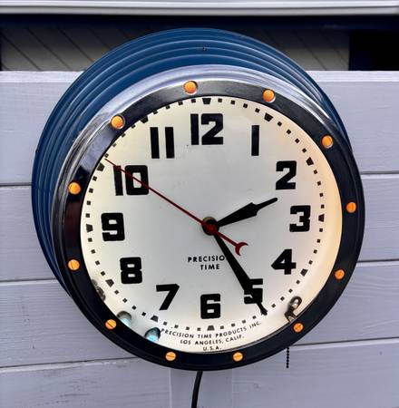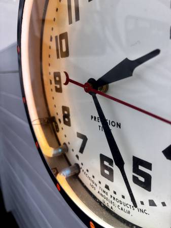 VINTAGE 1950s Neon Electric Clock, Precision Time Products Inc. Los Angeles Calif. U.S.A. 1940s. Works Great. 15.5" diameter 6" deep. White neon color. Modern 9 foot long cord.