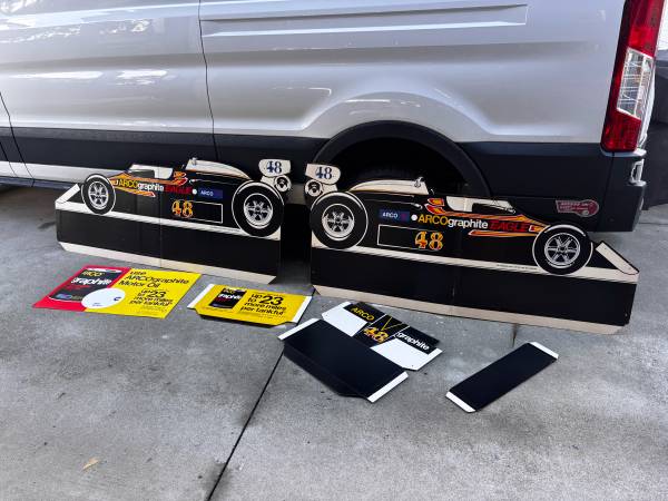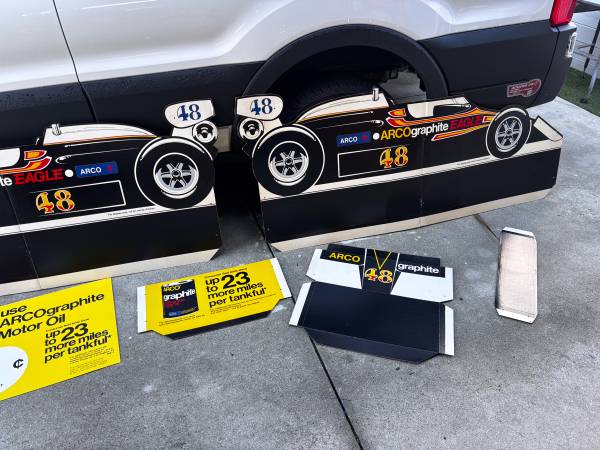 vintage 1970s indy car cardboard retail store display promotional ARCOgraphite motor oil promotional cutouts in the shape of race cars and accompanying advertising signs. 64" long. 1975