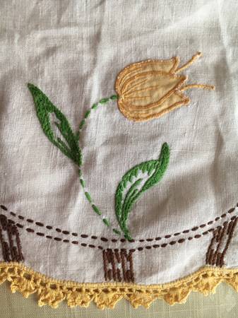 Vintage linen fabric. Yellow-gold crocheted border.