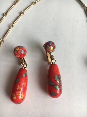 Vintage Millefiori Red-Orange Art Glass Bead Necklace and Millefiori Earrings - $40