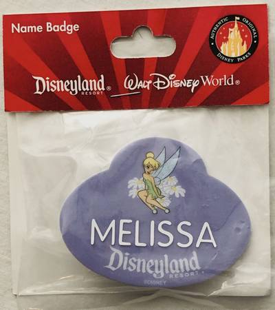 Disney park exclusive name badge pin features princesses BELLE, AURORA and CINDERELLA. The name badge is longer available at the parks. It can also be a magnet or keychain. Not sure if the parks will still engrave your name for you. A local trophy business may be able to personalize for you or I can cut a vinyl sticker with your name for free if you request one (see last photo)