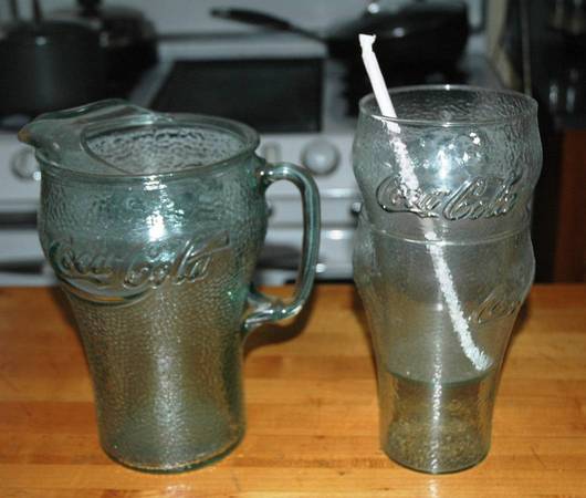 Coca Cola pebble aqua Blue Pitcher With 2- 16 oz. and 6- 12oz. Matching Glasses. Vintage Indiana Glass Coca Cola/Coke green pebbled serving pitcher. Evergreen color. Made in U.S.A. Cincinnati, Ohio....