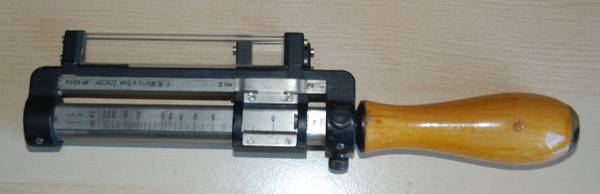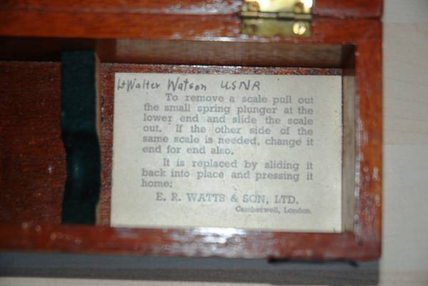 Three reversible brass inserts calibrated on both sides in yards, correspond to various base heights, (20 and 25 feet, 30 and 35 feet and 40 and 50 feet). They are fitted along the axis of the instrument. When the scale for the appropriate base height is selected and inserted, the carriage can be slid for coincidence and the distance read at the index mark on the sliding carriage.