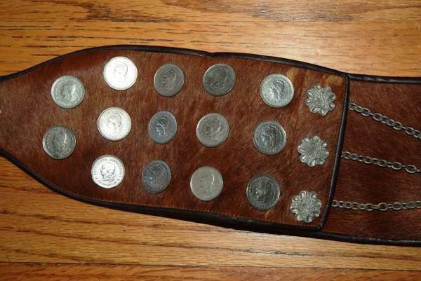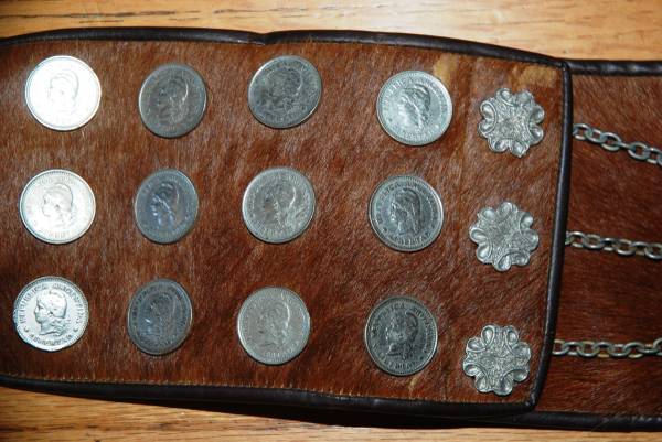 Amazing Argentinian Gaucho belt estimated 1929-1960. Belt is of brown horsehair leather. There are 25 (14 one side 11 on the other ) of the coins riveted to the belt. Coins are the same on both sides (REPUBLICA ARGENTINA, LIBERTAD.1 PESO 1957- 1962). The center medallion is of a horseshoe with horse in center. The three chains on each side run from the horseshoe to three silver toned button coins (sun with Republica Argentina) keeping the medallion in place. Gauchos are the Argentina cowboys and protectors. There is interesting information on gauchos on Wikipedia. Belt is 37" long and would fit 28" - 34". It is 3 1/4 " wide at the center and 3" at each side where the coins are. The gauchos wear this with the medallion in the front and buckled in the back.
