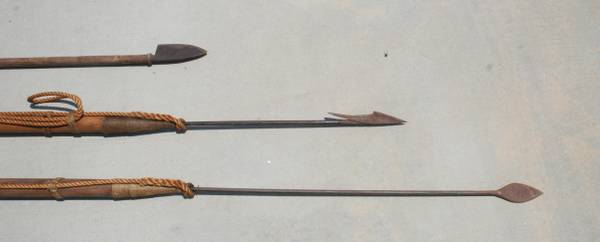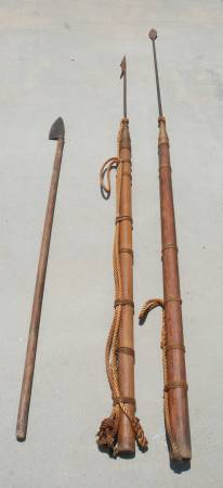 Vintage New England Nautical Whaling Harpoons/ Authentic blubber knife. Two Harpoons one 8' long the other 7' 120.0 5' Authentic blubber knife 140.0 All pieces 200