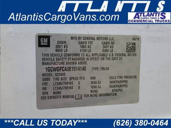 Why buy from Atlantis ? We have Multi-Point Inspection and Goodwill 30 Day Warranty on all our trucks and vans. We have been selling quality trucks and vans since 1990. You are looking at a 2014 Chevrolet Express 2500 Cargo Van 48,682 miles, AM/FM Stereo ,Air Conditioning. Stock: 10752 Vin: 1GCWGFCA0E1914148