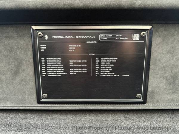 This Ferrari 812 Superfast also includes Clock, Climate Control, Tachometer, Multi-Zone Climate Control, Memory Seat Position, Cruise Control, Power Steering, Telescoping Steering Wheel, Power Windows, Steering Radio Controls, Power Mirrors, Leather Steering Wheel, Driver Airbag, ABS Brakes, Passenger Airbag, Intermittent Wipers, Side Airbags, Keyless Entry, Rear Defogger, Security System, AM/FM, Rear Spoiler, Sport Seats, Center Arm Rest, Cup Holders, Remote Fuel Door, Remote Trunk Lid, Vanity Mirrors, Heated Mirrors, Rear Fog Lamps, Daytime Running Lights, Parking Sensors, Reverse Camera, Roll Stability Control, Tire Pressure Monitor, Premium Sound, Carpeted Floor Mats, Overhead Console, Aux. Audio Input, HD Radio, Voice Control.