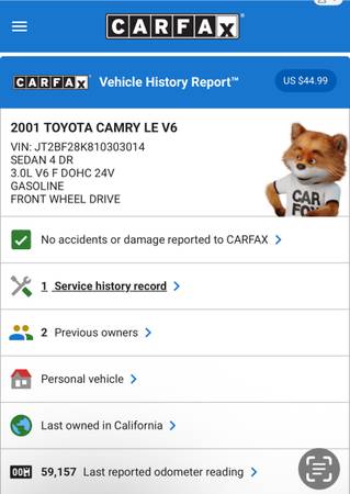 2001 TOYOTA CAMRY XLE WITH ONLY (59835) ORIGINAL MILES 6 CYL