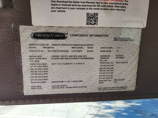 Cummins diesel engine, DEF system (CA legal), automatic transmission, air brakes, air ride suspension.