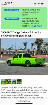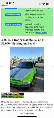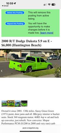 Owned it since 2001. 130k miles. Sassy Grass Green (1971) paint, door jams and all. Blk/grey interior w bucket seats. Stock 360 magnum motor. 46RE 4sp auto w od and lock up converter, just rebuilt. New converter. Mopar Performance PCM ($1200 in 2000 and very rare) carb sticker present. Mike Leech headers from Dodge. CARB sticker present. One off professionally done cold air, ram air system. K&N filter. Custom exhaust - Hand made high flow Y - 3 inch front to back - custom (714) 392 - zero 67 zero. high flow Cat (no codes) - Flowmaster 40 - 3.5” tip. PCM was further tuned by one of the best, but our gas is su ch sh it I went ahead and converted the truck to Ethanol. 100+ octane and 30% oxygenated, and available everywhere now! Thx Pearson Fuels! Download the app now to see all the stations. https://www.pearsonfuels.com/e85-gas-app/ Truck hauls ass. Sony head unit with fosgate amp and I forget who’s speakers in doors, plus the sub behind seat in a box. Rare all clear front running lights/turn signals. New rear taillights. Street Scene electric mirrors. Welded in rare and super sexy roll pan. Lowered with 4130 tubular A arms and teflon bushings. 2” blocks. I have 3 inch blocks as well, but then you can’t put anything in the bed. New shocks. 90/10 in front but have ICON 50/50 too. New steering rack and pump. All new no dust brakes, new drilled slotted rotors, new rear drums. New radiator and water pump. 9.25” Mopar limited slip 3.91 diff with new bearings, crush sleeve and seal. Synthetic Amsoil and Mopar additive. Driveshaft serviced. New Nitto 275/17’s on 10 inch “cast Iron” colored R/T aluminum wheels. Price drop - No reasonable offer refused - will trade for Cummins Dually. I am going racing again and to be able to tow. Thought this was going to the grave with me, but now I need it GONE, make an offer, Don (714) 392 - zero 6 7 zero. Plz text.