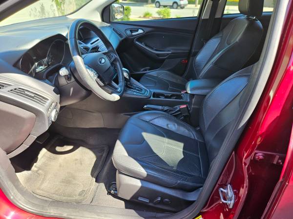 Red 2015 Ford Focus 4-door hatchback, low miles, leather seats, alloy wheels, tinted windows. Well-maintained vehicle, consistently serviced with fresh tires.