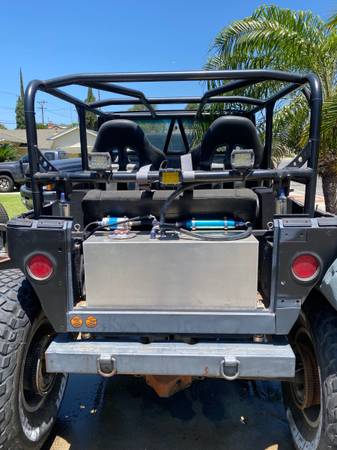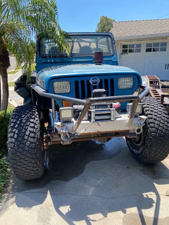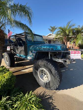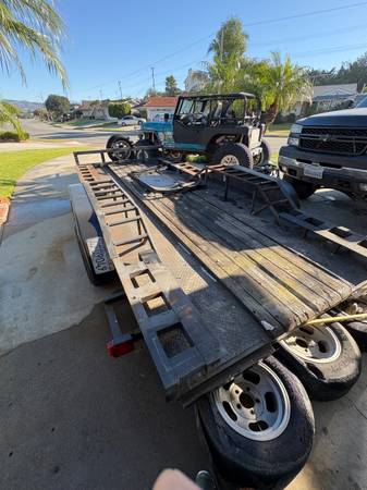Trailer was custom made with drive over fenders for the jeep. New marker and tail lights new wiring up front tires are in great shape. Jeep has 538 gears Detroit lockers Dana 44s out of a wagoner thick wall axle tubing custom roll cage tied to the frame 4 link rear leafs up front. KMC headlock 40” BFG KR3s with spare smittybuilt 9500 winch inline 6 5 speed manual with a 4-1 transfer case granny gear comes with soft top and skid plate crow 4 point harness I’m sure I’m forgetting something it’s a fun rig it will go anywhere. Off-road only green sticker. It has fox air shocks with 18” of travel in the rear and 16” up front. And if you want some kind of report or build sheet don’t waste your time texting me I’ve listed everything I could think of that’s on it.It has a rear seat with a child’s harness bump stops in rear