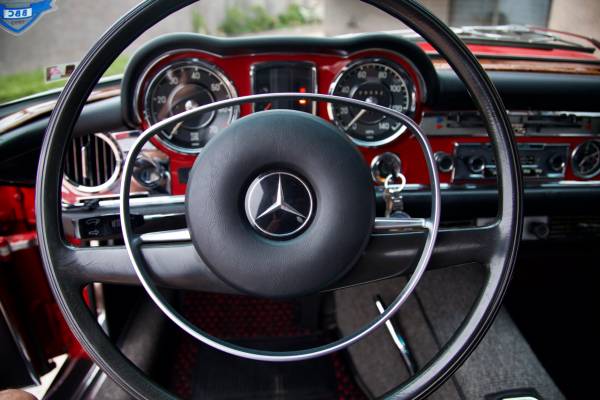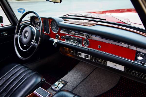 The car is equipped with power steering, four-wheel disc brakes, and independent suspension, all of which have been overhauled during the last 12 years.The cabin was reupholstered during current ownership and features bucket seats trimmed in Black MB-Tex that extends to the door panels. Interior appointments include a Becker Europa radio, an analog clock, a floor-mounted gear selector, and air conditioning.