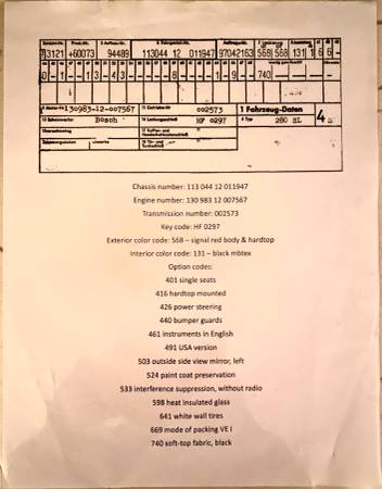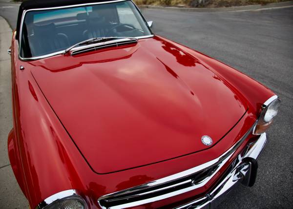 The W113 SL was designed by Friedrich Geiger, Béla Barényi, and Paul Bracq. This example is wearing its original shade of Signal Red paint, having never needing restoration and maintained by collectors since new. Features include a new black soft top, a body-color removable hardtop, US-specification headlights, and a retractable antenna.