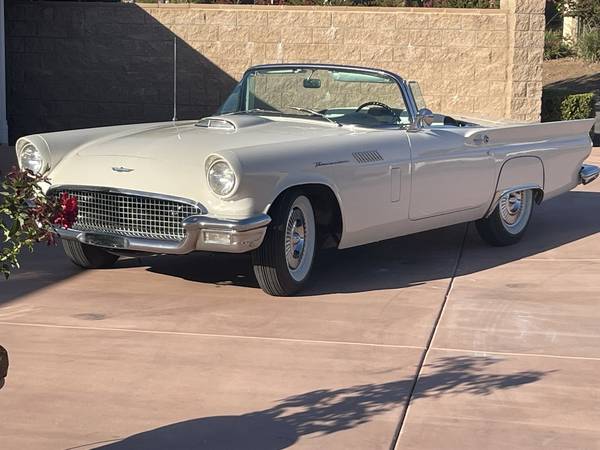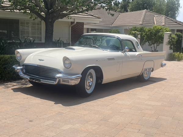Beautiful 1957 Ford Thunderbird: D Model, Hard Top with Port Holes, This classic Thunderbird has just been professionally repainted with the Original Colonial White, New Chrome Bumpers Front & Rear, New Black Carpet, This Thunderbird has POWER STEERING, ELECTRIC 4 WAY POWER SEAT, POWER WINDOWS & AIR CONDITIONED as well! Clock Rebuilt and Works. Town & Country Radio A.M. Works, Engine Dress Kit, Original Wheel Covers, New Gasoline Tank. Ford V-8 312 CID Ford-O-Matic Transmission, New Seat and New Foam, New Brakes, Chrome Dress Up Engine Package, BRAND NEW UNUSED AMERICAN MADE GENERAL TIRES WITH 2 1/4" WIDE WHITE WALLS, New Chrome Bumpers Front & Back, Absolutely NO RUST! ALWAYS IN SOUTHERN CALIFORNIA, New 12 Volt Battery also. This Thunderbird was Sold New in Los Angeles from the Ford Store. Clean/Clean/Clean. I believe there is no damage of any kind.