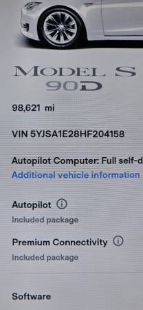 2017 Tesla Model S 90D, White on White, with 3rd Row Jump Seats facing rear, Very Nice, Auto, 98k, Power Windows, Power Locks, Tilt, Auto Self Drive Cruise, New Tires, am/fm/Nav/BT/cd etc…, Premium Package included for life of the vehicle. Ice Cold A/C, Vehicle is in Excellent Condition inside and out, Vehicle has always been serviced and maintained, Runs Great…. …. Only 98k Actual Miles, 2 keys, books etc…..