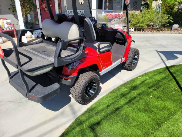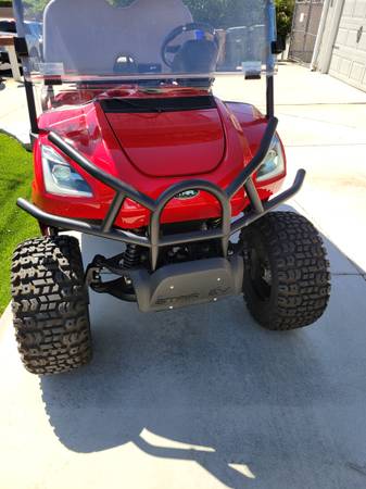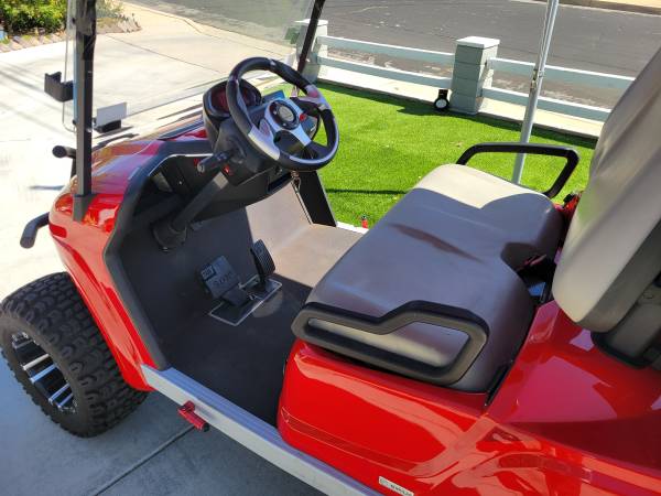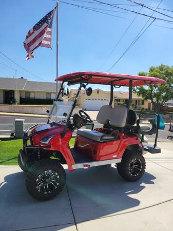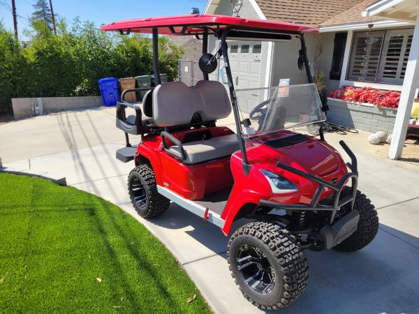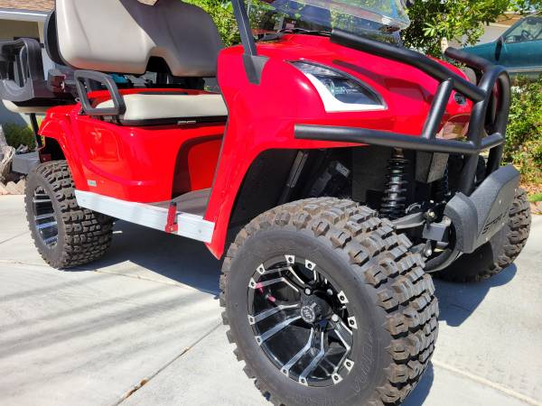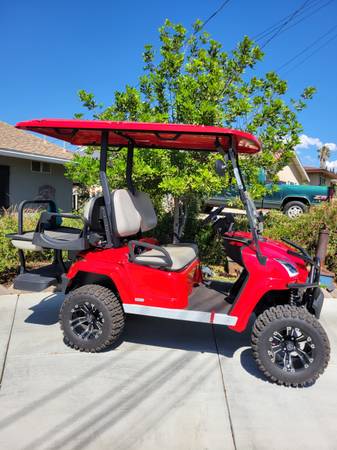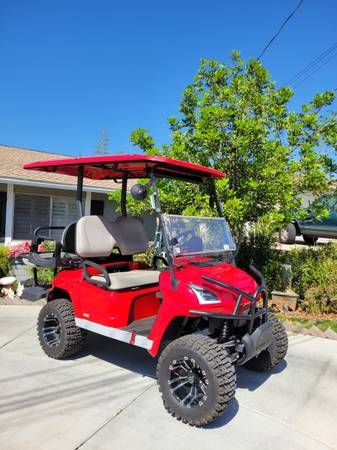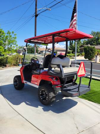 LSV, street legal and CA title in hand. Lifted. Torch Red. 25-30mph. Lots of torque and power for uphill. Reverse camera. DOT windsheild. Led self canceling turn signals, added led turn signal lights on mirrors. Headlights, daytime running lights, flashers, horn, tail lights, seat belts. Lithium battery. Onboard charging system. Smart battery management display system on dash. Curtis AC Controller. Usb 12v accessory plugs. Full digital display dash with speedometer, odometer, battery indicator. Front trunk storage. Rear trunk storage/ ice chest. Locking glove box. 23" all terrain tires. Premium wheels.