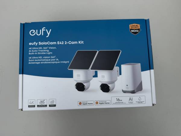 Hi there! Up for sale is a new and unused dual 4K security camera system from Eufy. It is the E42 Solocam with AI auto tracking and a built-in strobe light. Comes with the homebase for at-home...