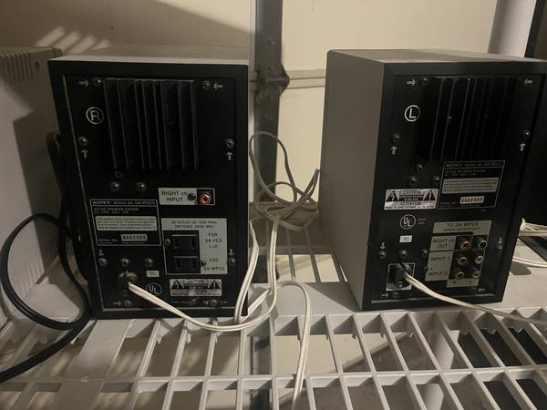 Older computer speaker system from circa year 2000. Don't be fooled though, this thing sounds great. It can get pretty loud and the subwoofer packs a lot more low end than you might expect. We used to use it for small backyard parties all the time and it was more than enough. It's got some wear and tear but that's pretty much cosmetic.