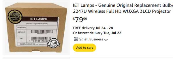 Up to 3x Higher Color Brightness and 3x Wider Color Gamut than 1-chip DLP projectors, plus 4,200 lumens of color and white brightness for stunning images even in bright rooms. Project up to 300" in WUXGA (1920 x 1200) with 15,000:1 contrast for clear text and detail. Low Maintenance, Compact & Flexible, Ideal for small to medium spaces with multiple connectivity options. Light use for a couple of years. Needs a new bulb which can be purchased on Amazon for $80 (photo included). This same unit is $1400+ brand new on Amazon. Make me an offer, $299 OBO.