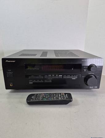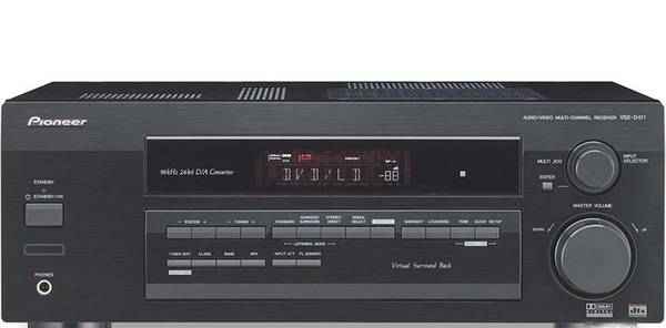 Pioneer VSX-D411 is a 5.1 channel A/V receiver that supports Dolby Digital, DTS, and Pro Logic II decoding. It offers 100 watts per channel into 8 ohms (20-20,000 Hz) at 0.2% THD, or 100W x 5 in surround mode. It also features 4 audio DSP modes, Midnight listening mode, and wide-range frequency response. The receiver includes both optical and coaxial digital inputs.
