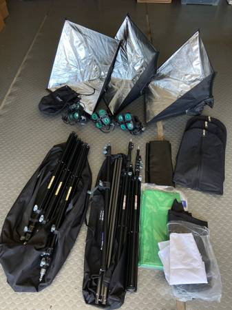 Lincostore Flora 7ft Lighting Kit Includes 3 collapsible softbox lights and a 9ft background kit with black and green cloth backdrops. I can not find 2 of the light cloth covers, but you need them,...