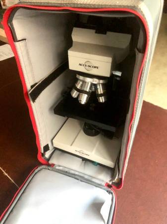 Clean Binocular 4 objective Accu-Scope microscope with travel storage case. 10 x eyepieces. $110