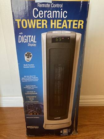 Lasko Ceramic Tower Heater with remote control (batteries not included). It was rarely used and box is included. Model Number 5521 Home Depot sells it new for more that $85 buck if you include CA...