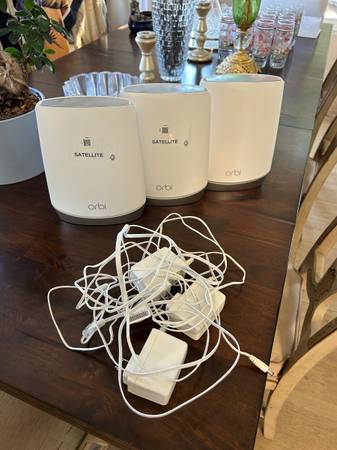 Includes one wireless router model number: RBR750 - and two satellite wireless units model numbers: RBS750. Great condition not compatible with our Wi-Fi where we are moving. Pay $275 new, everything works - power cords included. $120 cash only. No scams.