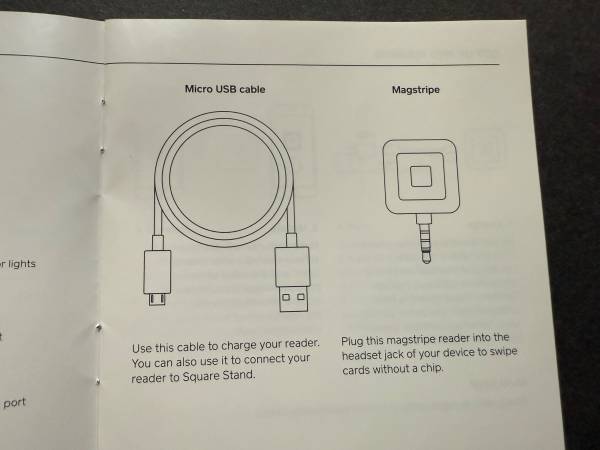 - Charging Cable - Cable to charge your reader. You can also use it to connect your reader to Square Stand.