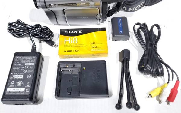 Pre-owned in great condition & fully functional. This camera comes with a carrying case, the power supply, an external battery charger, a good working battery, a brand new 8mm cassette tape, a mini tripod and the audio/video componnt cable to hook it up to your TV. See pictures for a detailed look. Available for pickup in the city of Stanton close to the Stanton Central park. Message me if you want to come by.