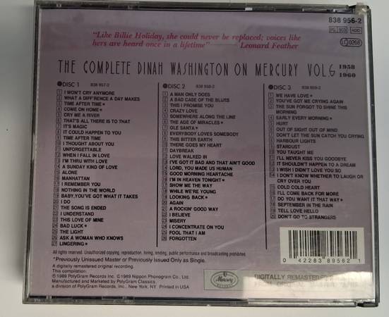 3 CD's of Dinah Washington from 1958-1960 by Mercury Records. Great condition.