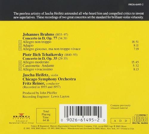 The peerless artistry of Jascha Heifetz astounded all who heard him play the violin and compelled critics to invent new superlatives. These recordings of two great concertos set the standard for brilliant violin virtuosity. Chicago Symphony, conducted by Fritz Reiner.