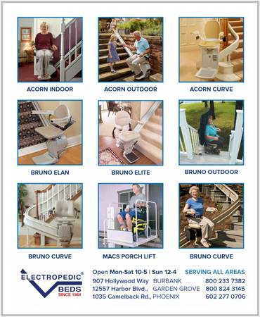 Mobility stores like serve as comprehensive hubs for a wide array of electric homecare products designed to enhance independence and quality of life. These establishments typically stock adjustable beds from manufacturers like Flex-A-Bed, Dawn House, and Supernal, often available in twin, full, queen, king, dual queen, and dual king sizes, with varying lengths and features like massage, heat, and zero gravity positions. For those requiring medical support, hospital beds (e.g., Drive Medical, Medacure, ProBasics) come in full-electric models with three or five motors for hi-low, Trendelenburg, and reverse Trendelenburg positioning, and specialized bariatric beds with increased weight capacities (up to 1,000 lbs or more) and wider surfaces. Mattresses offered include latex natural organic mattresses, valued for their breathability, durability, and hypoallergenic properties. Lift chair recliners from brands like Pride Viva and Golden Technologies are popular, featuring two to five motors for independent back and leg adjustment, infinite positioning, power lumbar, power pillow, and optional heat and massage. Stairlifts are a staple, with manufacturers such as Stannah, Bruno, Harmar, Handicare, and Acorn providing straight, curved, and outdoor models. For personal transportation, mobility scooters (e.g., Pride Mobility's GoGo series like Ultra X, Traveller Elite, Sport, Folding Carbon, and Victory models) are available in 3- and 4-wheel configurations, alongside Pride Jazzy Powerchairs electric wheelchairs (e.g., Jazzy Air 2, Go-Chair, Jazzy Carbon), known for their maneuverability and compact folding options. Finally, Wheelchair Elevator VPL Vertical Platform Lifts (like Mac's Vertical PL50 Home Chair Lift) offer a solution for overcoming vertical barriers, providing access to porches or elevated entrances. When asking for these products, people use a variety of terms: adjustable beds might be called "power beds," "electric beds," or "sleep systems"; hospital beds are often referred to as "medical beds," "home care beds," or "hi-low beds"; bariatric beds might be searched as "heavy-duty beds" or "extra wide beds"; latex natural organic mattresses are also "eco-friendly mattresses," "natural rubber mattresses," or "non-toxic mattresses"; lift chair recliners are commonly "power lift recliners," "elderly recliners," or "stand-up chairs"; stairlifts are also known as "chairlifts," "stairway lifts," "stair glides," or "stair climbers"; mobility scooters are frequently called "electric scooters" or "senior scooters"; Pride Jazzy Powerchairs electric wheelchairs are simply "power wheelchairs" or "motorized wheelchairs"; and Wheelchair Elevator VPL Vertical Platform Lifts are often referred to as "porch lifts," "wheelchair lifts," or "vertical lifts."