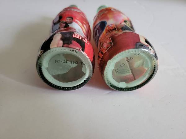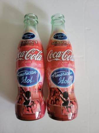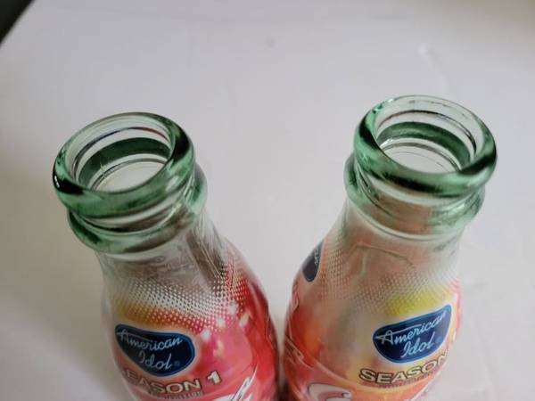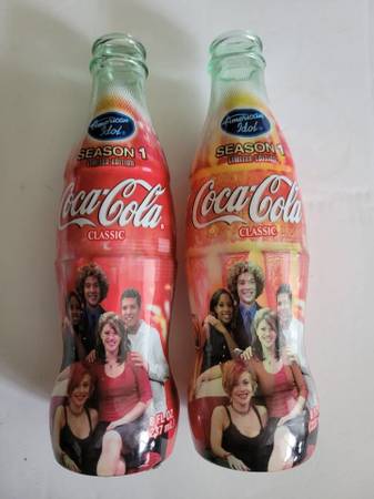 Lot of 2 American Idol Season 1 Limited Edition Wrapped Coca-Cola Bottles - 8 oz. These bottles are empty with no caps. There are no cracks or chips in the glass, and the overwrap designs are intact. One bottle has slight fading of the red color (see photos).