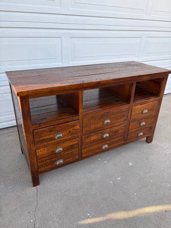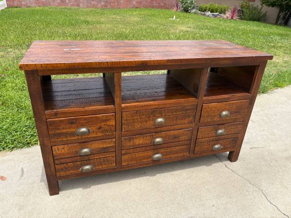 Gorgeous low-profile media cabinet made from solid wood with a rich, hand-applied stain that brings out the natural grain. Sturdy construction, clean lines, and a timeless design that fits with almost any décor.