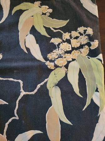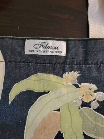 Vintage Filazzi Tote Bag from Sydney, Australia. Floral design with colors of navy, green, and beige/tan with cream colored straps. Tote bag is lined. Inside lining is cream colored and has an inner double pocket (larger pocket with a pen pocket). Inside pen pocket and one area on outside of tote bag have a blue stain. Outside fabric has some slight fading. Straps need to be sewn down at the top on one side for reinforcement. Overall, tote bag is in nice condition.