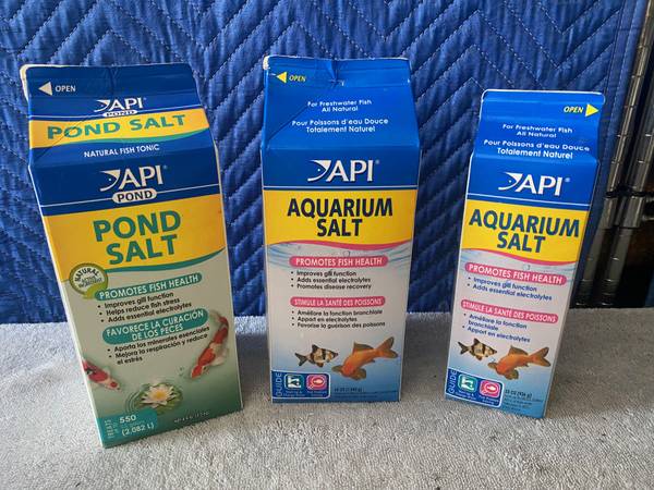 All like new and full. Ready to use. * First photo: - API Pond Salt 4.4Lbs. $10 - API Aquarium Salt 65Oz. $10 - API Aquarium Salt 33Oz. $5 * Second photo: - MarineLand Premium Activated Carbon 40Oz....