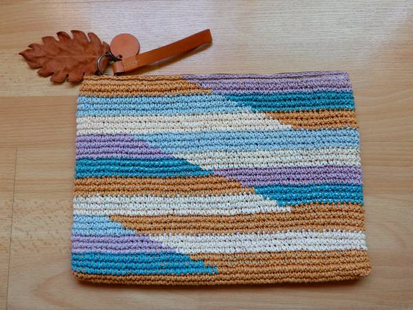 Exterior made from palm raffia fiber cord (Africa?), one main canvas interior compartment, two internal pockets, plus one snap closure pocket, with Italian veg-tanned cowhide autumn leave wrist strap to zipper