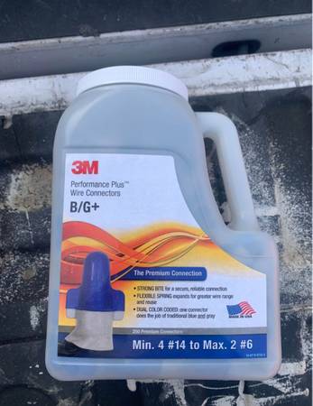 3M Twist-On Wire Connector, Rounded Wing Shell, Live Action/Square Wire Spring, 14 To 6 AWG Aluminum/Copper Wire UPC: 054007431510 Cat #: B/G+JUG (131 jugs available NEW) $50 each, must buy all