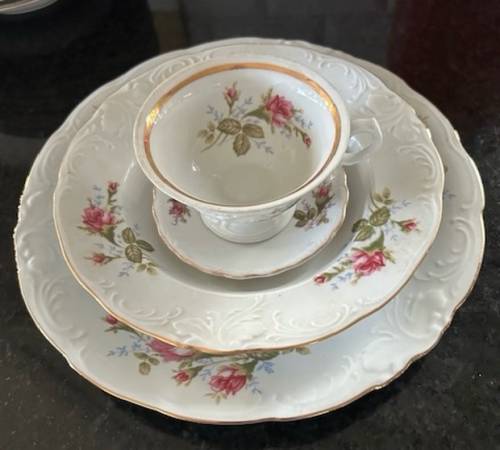 This lovely set features pink roses on scalloped embossed china with gold trim. The set is in excellent condition and would be perfect for vintage-country-cottage decor