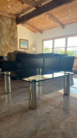 Designer Pace Collection 1970’s Mid Century Modern Vintage Brass & Beveled Glass Cocktail Table Glass: 42 W X 42 W Brass Cylinder Legs: 16” Glass + Brass Legs: 17” Heavy Thick Beveled Glass...