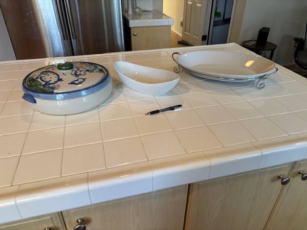 Ceramic Serving Dishes Set all together for $8 Includes a decorative lidded dish, a small bowl, and a large platter with metal stand.