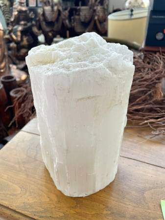 Striking natural selenite sculpture showcasing beautiful vertical striations and a soft, ethereal glow. This impressive 9-inch piece weighs approximately 10 pounds and was formed over millennia in Moroccan desert salt flats. The natural crystalline texture reflects light beautifully, making it an ideal statement décor piece, display accent, or collector’s specimen.