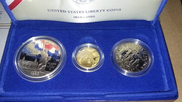 A set of $5 gold coin, silver dollar and clad half dollar. Dated 1986. This set has 0.24 troy oz of gold in the gold coin