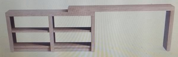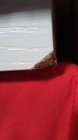 Dillon Peninsula L Shape Rotating Desk MW, SKU # 1183130. Damaged top corner would be facing against the wall if you're putting this desk in a corner. It is about 3/4 inch damage. A spray can of white paint could mask over it if desired