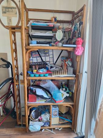 BAMBOO SHELF, 4-TIER, METAL JOINT IN BACK, NO SHAKING Pretty sturdy Freestanding .Metal shelf rails screwed in the back with an X-crossing metal strip that stops shaking or tilting. 96”H, 30”W,...