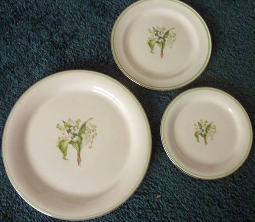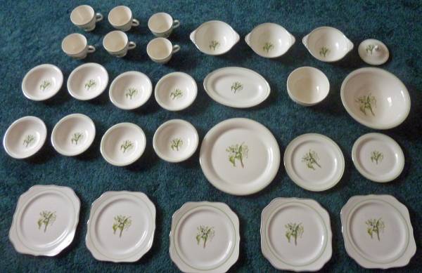 Vintage Lily Of The Valley China. 29 pieces, Homer Laughlin and Nautilus brands. Made in USA. See photos for additional description detail. If interested, email or call Bill. No shipping available,...